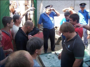 — Міліція, зробіть щось, чому бездієте, — чути голос із гурту. Правоохоронці стоять позаду всіх. Невпевнено декілька йдуть до воріт.