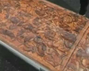 На пиріг пішло 20 тисяч яблук, майже 400 яєць, кількасот кілограмів борошна, масла та цукру. І хоч виробляли гігантський смаколик не одну ніч, - з'їли його менше, ніж за годину.