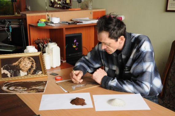 "На просту картину йде півсклянки кавовою гущі, жменя піску і півдня роботи. Портрети можу робити дуже довго — місяць і більше. Легше робити портрет, коли я людину бачив хоч раз вживу. Запам'ятовую її риси, погляд. Але частіше роблю по замовленню з фото. Найбільша моя робота – метр на сімдесят — висить у касі цирку. Найменші – розміром як фотографія, я там голкою звичайною працював і в окулярах", - каже художник.