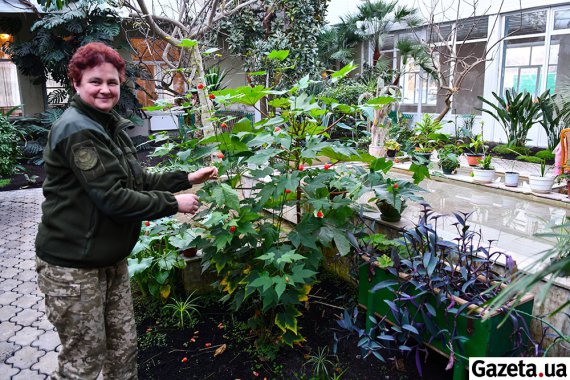 "Оранжерея лишилась нам у спадок від 7-го полку. Заснували сад у другій частині 1970-х. Найстаріша - пальма. Її посадили 1976-го. Маємо ще й драцени, араукарія, юкка, інжир, фікуси, красули, стреліція, статифілум, агава. Монстера - она з найбільших рослин. Відцвіла недавно. Досвідом та порадами обмінюємось із львівськими ботанічними садами", - каже жінка. Людмила Пушкін опікується садом у вільний від військових обов'язків час. До роботи залучають військових.