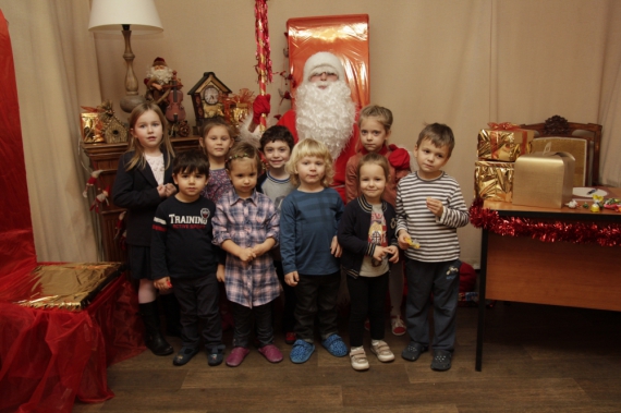 Діти по черзі розповідають віршики. Потім хором заводять "В лесу родилась елочка". Поки вони співають, Дід Мороз підписує кожному по листівці, виймає і роздає цукерки із великого червоного мішка, що стоїть поряд зі столом. Встає з-за стола і збирає усіх дітей біля каміну для колективної фотографії. Далі фотографується з кожною дитиною окремо.