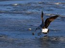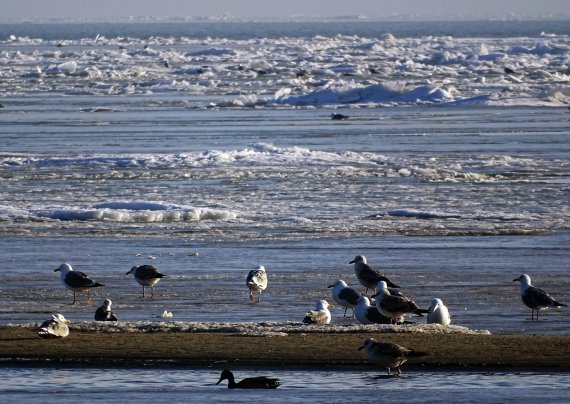 На фото видно безліч чайок біля берега, море, яке вкрите льодом і снігом, а вдалині можна побачити, як працює металургійний комбінат "Азовсталь".