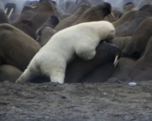 Морж, як здобич, для полярного ведмедя виглядає дуже спокусливо, але з огляду на розміри й сили цього звіра, а також наявності двох величезних бивнів, впоратись з ним непросто. Найчастіше, таке полювання закінчується для нього повним провалом.