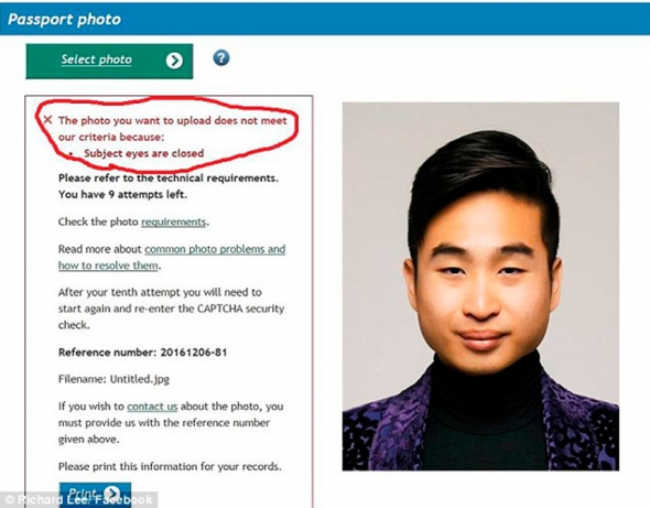 Громадянин Нової Зеландії Річард Лі навчається в Австралії. Хотів оновити паспорт через інтернет. Коли завантажив свою фотографію на сайт, програма подумала, що чоловік знятий із закритими очима, та попросила інший кадр.