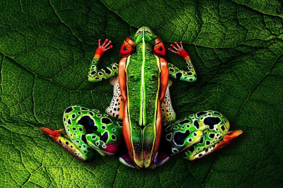 Художник не просто розписує тіла пензлями, він конструює з тіл необхідні форми. Кращою роботою автора стало зображення тропічної жаби. Основа — п'ять розписаних людських тіл.
