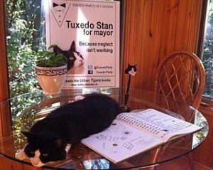 У канадському Галіфаксі господар кота по кличці Стен в смокінгу (Tuxedo Stan) висунув свого вихованця в кандидати в мери міста, повідомляє Metro. Незважаючи на те, що місцеві закони забороняють тваринам брати участь у виборах в якомусь якості, популярність чорно-білого кота зростає день від дня. 19 вересня група підтримки кота прийшла послухати дебати кандидатів у мери.