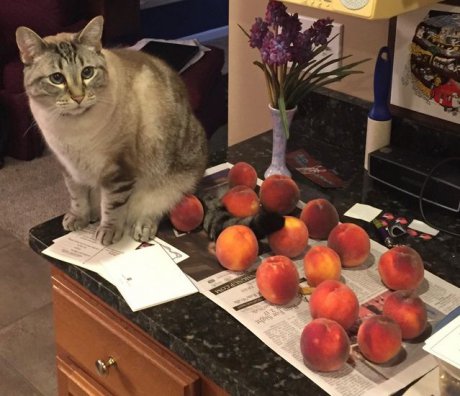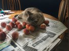 Американка Лідія Кутре опублікувала світлини свого кота, який любить сидіти біля персиків.