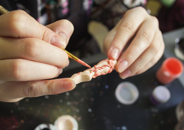 "Одна з найскладніших закладок - дракон. Збирається ніби конструктор. Окремо ліпимо хвіст, ноги, крила. Розфарбовуємо у коричневий колір, - продовжує засновниця бренду. - Також люблю серію "Кабаре" - ніжки танцівниць у панчохах-сітках та червоних черевиках на підборах".