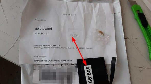 "Прийшло повідомлення, що Новою поштою надійшла посилка з привабливим описом "прикраси". Так як я нічого не замовляв, набрав відправника, але там відразу скидають (вже тут зрозуміло, що 99% це лохотрон). Під'їхав на відділення, щоб подивитися, що ж в посилці ... Оскільки це була наложка, дозволили оглянути посилку. Всередині був листочок і герметичний пакетик, на якому був стікер $29,99. В папірці ж було €29,99. Співробітниця Нової пошти сказала, що герметичний пакетик я відкривати не можу, але я переконав її, що це розвод, і їй самій стало цікаво. Усередині пакетика був кулон, який візуально нагадує золотий, але по факту це просто пластик", - пише Бобок.