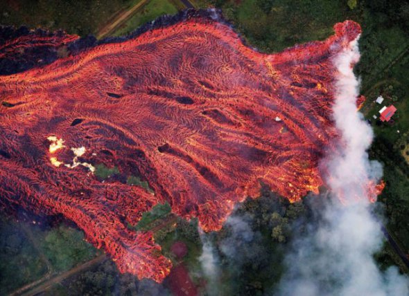 Вид згори показує катастрофічну силу швидко рухається потоку лави з вулкана Кілауеа на Гаваях, поміченого тут 19 травня. Виверження зруйнувало майже 700 будинків і призвело до переміщення тисяч.