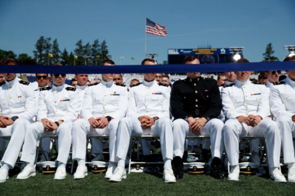Військовослужбовці слухають, як президент Трамп говорить під час церемонії вручення дипломів і введення в експлуатацію в Військово-морської академії США в Аннаполісі 25 травня.