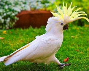 На відео білий какаду розгулює поміж кошенят і копіює їх нявкання. На спробу одного з пухнастих торкнути його лапою починає сердито шипіти. Виходить точнісінько так само, як це роблять коти.