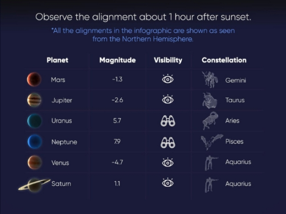 Меркурій, Юпітер, Уран, Марс, Нептун та Сатурн вишикувалися у ланцюжок по один бік від Сонця з розкидом до 30°. Без додаткового обладнання можна було на небі розгледіти Юпітер, Меркурій, Марс та Сатурн.