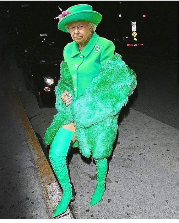 91-річна королева на колажах одягнена в міні-шорти, на ній немає без бюстгалтера і вона на високих підборах.