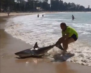 Навколо акули, яка застрягла на березі, почав збиратися натовп відпочиваючих. Але 33-річний чоловік, який працював у будинку неподалік, швидко скинув штани, схопив акулу за хвіст і потягнув у воду.