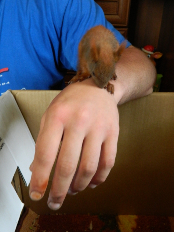 "Нам про білочок розказали діти, які прийшли за ящиками в магазин. Четверо маленьких білченят упали з дерева. Коли Вітя приїхав, хтось із дорослих уже поклав білочок у ящик і примотав до дерева. Але так вони не могли би вижити - діти з ними гралися, білка відчула людський запах і не повернулася по своїх дитинчат. Тому ми забрали їх додому", - розповідає Оксана.
