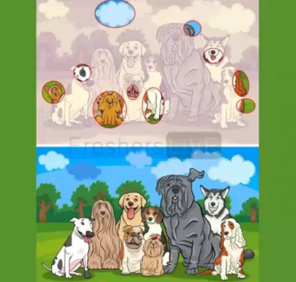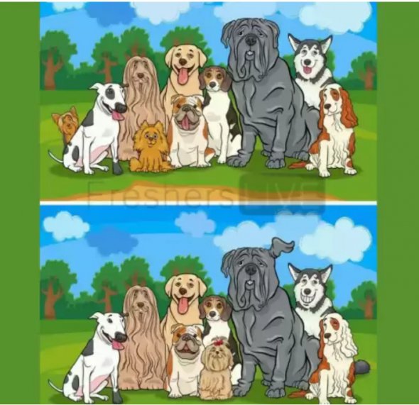 На зображення сидять собаки різної породи. Здається, вони ідентичні. Але все-таки між ними є відмінності. Їх аж 10. Знайти потрібно за 25 секунд.
