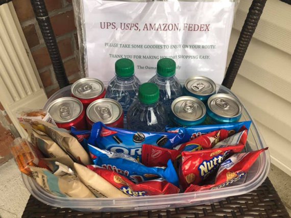 На щастя, є небайдужі люди, які піклуються про різдвяних ельфів, які важко працюють, щоб зробити свято кращими. Так, Кетті Ума залишила снеки для кур'єрів американських служб доставлення Amazon Prime, UPS, USPS та Fedex.