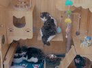 Температура повітря в такому будиночку підтримується в межах 27 градусів. Усередині є все необхідне для котів: їжа, вода, м'яке місце для сну й іграшки. За наявністю запасів стежать волонтери.