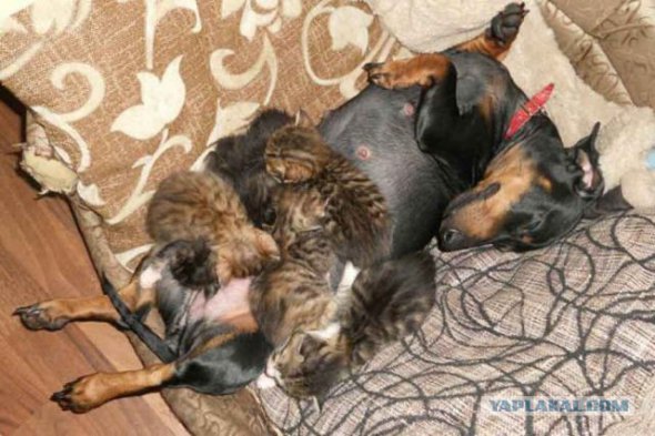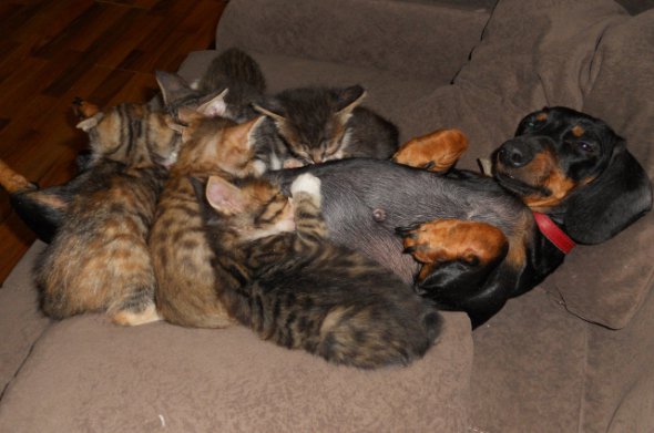 Кошенята осиротіли, коли їх мати померла при пологах. Беззахисна малеча могла загинути, якби не такса на прізвисько Чара, яка прийняла їх як рідних і вигодувала своїм молоком.