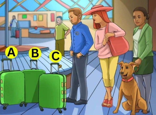 Валіза А належить жінці з собакою, а валіза С з биркою безпеки належить чоловікові в синій сорочці. Залишається валіза Б, яка, ймовірно, належить жінці в рожевому капелюсі.