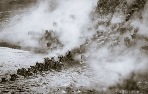 64-річний фотограф Інго Герлач відзняв тисячі антилоп гну, які переплавляються через річку в африканській савані. Таке дивовижне природне явище відбувається щороку.