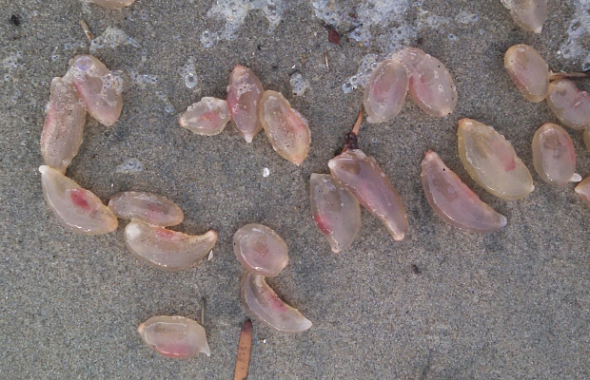 Професор з кафедри екології та еволюційної біології UC Irvine сказав, що скоріше за все це так звані "пелагічні покривники" або сальпи. Бочкоподібні безхребетні з м'якими, схожими на желатин тілами.