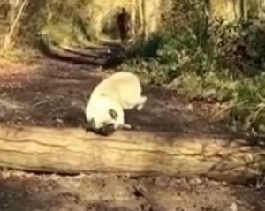 Дві собаки бігли лісом і наткнулися на велику колоду від дерева. Один пес майстерно перестрибнув її, а ось мопс не розрахував свої сили.