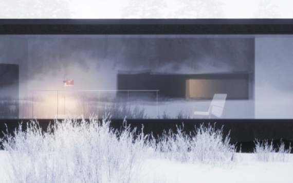 Безперервні горизонтальні вікна кожного з будинків дивляться одне на одного та відкривають перспективи виду на ліс, що розташований недалеко від незвичайних жител.