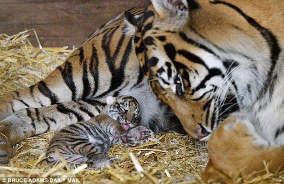 Маленьке тигреня виглядає дуже мило, лежачи в обіймах матері Сур'ї та батька Бави. Вони обоє тут живуть 7 років. Перед цими пологами Сур'я мала викидень.