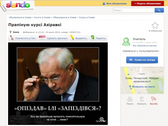 Поки оптимісти вчать англійську, песимісти - китайську, а реалісти - автомат Калашникова, українцям пропонують вивчати мову Азіровка. Таку пропозицію з'явилося у розділі "Освіта" на сайті приватних оголошень Slando.