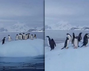 Українські полярники показали, як в Антарктиці пінгвіни гойдаються на крижаній глибі.