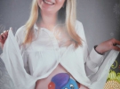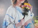 "Я вдягла вишиванку, бо за освітою філолог, а нині працюю у школі методистом. Мені учитель біології розказала про цей конкурс – я заповнила анкету і пройшла кастинг. Хочемо довести, що бути вагітною – це красиво і модно", - 22-річна рівнянка Віра Макрушина позує поруч зі своєю світлиною, де у неї на животі петриківський розпис. – "Мабуть, у мене буде донечка. Мушу весь час тримати осанку – трохи зігну спину, а дитина вже ніжками б'є мені по ребрах і одразу розпрямляюся".
