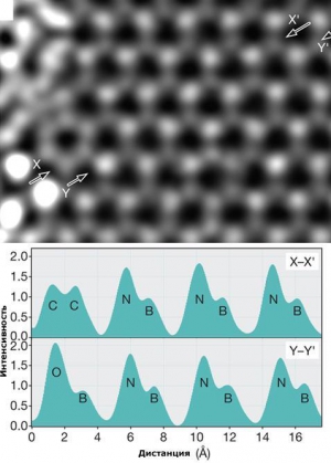 Окремі атоми бору, вуглецю, азоту і кисню, розташовані в монослої нітриду бору, були побачені та ідентифіковані за допомогою вдосконаленого електронного мікроскопа.