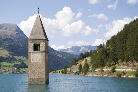 Затоплена церква в італійському селі Граун, розташованому недалеко від кордону з Австрією, - дивовижна пам'ятка, яка встояла під натиском води. Церква була побудована в 14 столітті, але в ХХ столітті в селі було розпочато будівництво ГЕС. Штучне озеро Решен затопило 163 будинки та 1290 акрів сільгоспугідь, а от церква вистояла. З тих пір шпиль дзвіниці височіє над водою, а, згідно легенд, під час сильного вітру тут навіть можна почути дзвін.