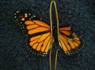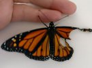 Самець метелика монарх трьох днів від народження. Він з'явився на світ з розірваним верхнім і нижнім крилами.