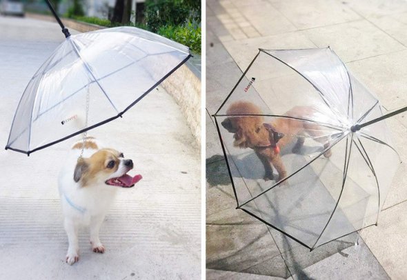 З парасолею для собак тепер можна не відкладати прогулянку в дощ. Цей аксесуар підійде невеликим песикам, які люблять неспішні прогулянки: тростина парасолі не дуже довга і від хазяїна далеко відбігти не вдасться.