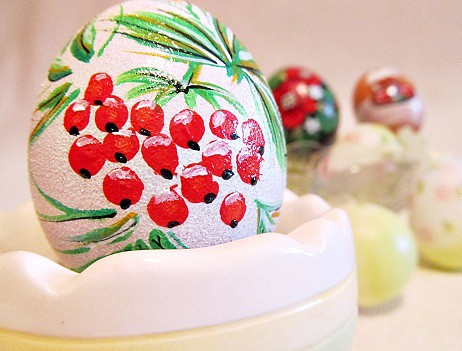 Відварене та охолоджене яйце потрібно покрити акриловою фарбою за допомогою губки. Якщо ви готуєте великодній сувенір,потрібно обережно видалити вміст сирого яйця через невеликі отвори в нижній і верхній частині. Після цього можна переходити до фарбування. Перший колір - це основа для нанесення бажаного малюнку. Її наносять губкою. Основний малюнок роблять ватяними паличками. Наприклад, можна намалювати гроно калини з листям або яйце в різнобарвних горошинах.