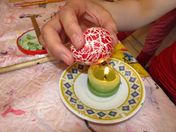 Для створення розпису краще обирати гладке яйце, без нерівностей та тріщин. На нього потрібно нанести бажаний візерунок простим олівцем. Потім по нанесених лініях потрібно накладати нагрітий віск спеціальним писачком. Його можна придбати або зробити самостійно. Далі потрібно зафарбовувати яйце від світлого кольору до темного. Віск наносять поступово на частини візерунку, які фарбують в один колір. В кінці потрібно піднести яйце до полум'я збоку, щоб не закоптити. Можна до запаленої свічки або розпеченої духовки на 5 секунд. Розтоплений віск, варто витерти ганчірочкою.