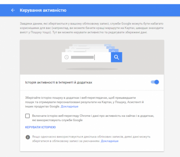 Для того, щоб відімкнути веб-додаток, достатньо натиснути на значок напроти параметрів, які відслідковує Google: "Історія активності в інтернеті й додатках", "Історія місцезнаходжень", "Історія голосового керування", "Історія пошуку YouTube", "Історія переглядів YouTube".