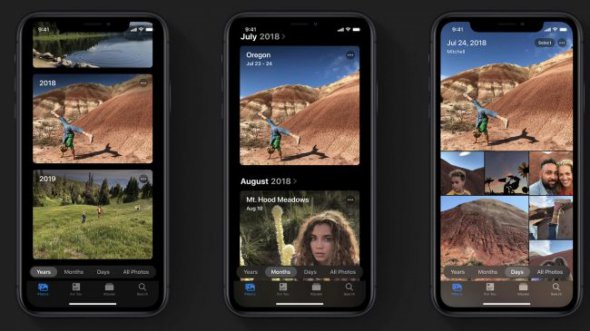В iOS 13 також оновлена вкладка Фото. Тепер галерею можна переглядати з різними рівнями сортування фото, включаючи інтерактивне превью зображень в нових папках. Додаток буде автоматично створювати персоналізовані колажі та анімації, приховувати однакові фото, вибираючи найкраще, а також сортувати їх по типу або тематиці.