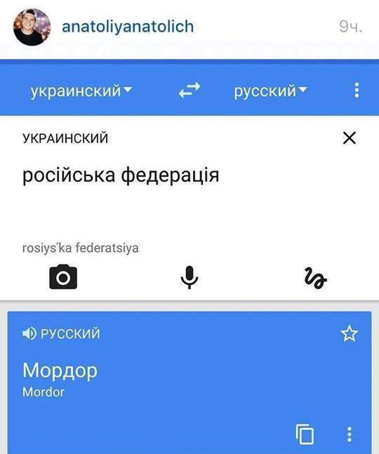 Веб-сервіс компанії Google Translate почав перекладати з української на російську мову словосполучення "Російська Федерація" як "Мордор". Це назва країни з книг "Володар кілець" англійського письменника Джона Толкіна. Ця держава була осередком сили Чорного Володаря Саурона. Він там збирав армію. Назву своєї вигаданої країни автор трактує як "Чорна країна", "Земля Тіні".