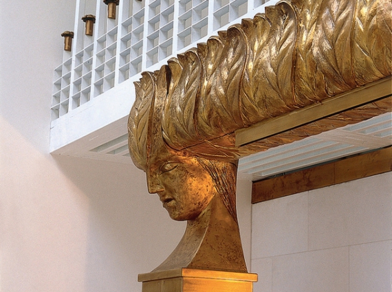 Головна деталь інтер'єру - це велетенська латунна модель хмарочоса у вигляді колони. У ній легко можна впізнати хмарочос Chicago Tribune Адольфа Лооса, але куди важче здогадатися , що таким чином оформлений камінний димохід.