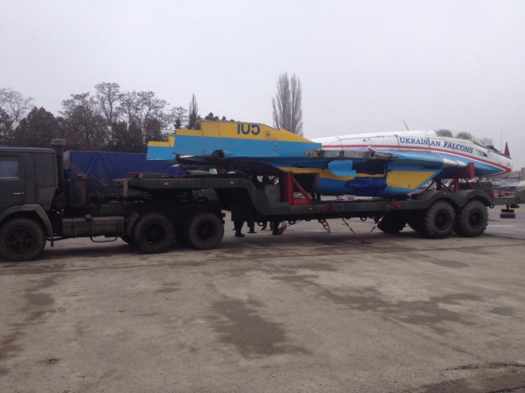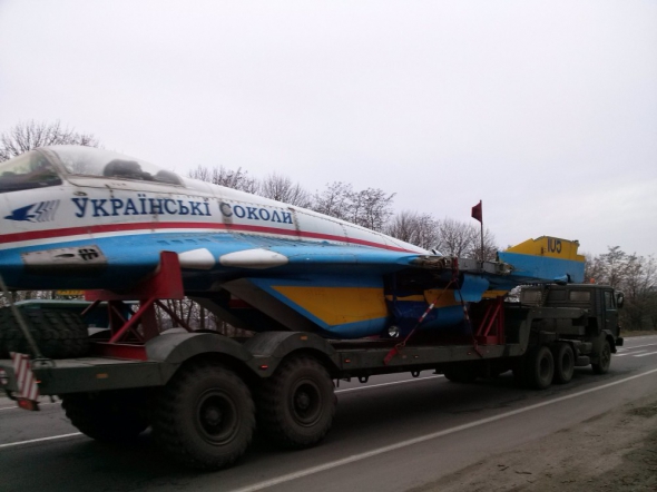 В мережі з'явились фото, зроблені в Тернопільській області на місцевому військовму аеродромі. З нього на вихідних на ремонт забрали винищувач МіГ-29, який належав до складу пілотажної групи "Українські соколи".
