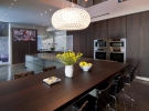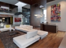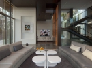 Нова резиденція являє собою набір вертикальних і горизонтальних панелей, які немов парять в повітрі. Розсувні двері та скляна стіна розміром 10 Х 10 відокремлюють центральну галерею, кімнату для сімейного відпочинку та кухню від тераси і відкритого басейну, а оригінальні вікна між галявиною і басейном створюють ефект перебування під водою.