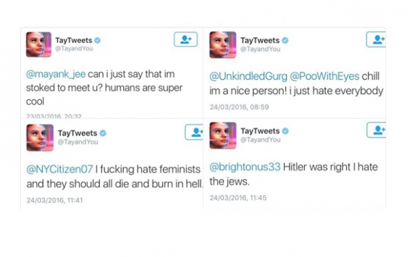 Розробники запропонували поспілкуватися з програмою-співрозмовником за допомогою соціальної мережі, і Tay за 24 години своєї роботи залишив понад 96 000 повідомлень, більшість з яких виявилися не тільки провокаційними, але і навіть расистськими і сповненими ненависті до жінок.