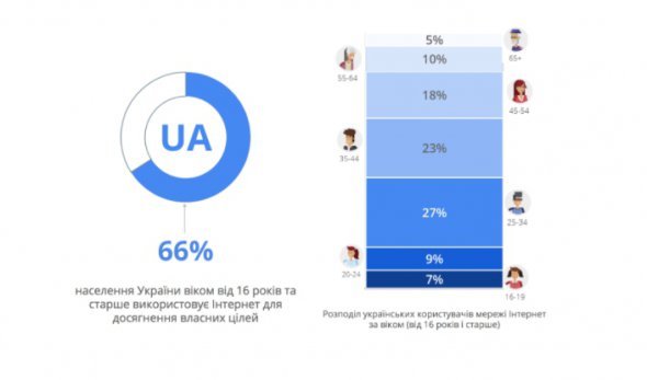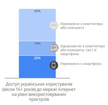 Найактивніші українські користувачі віком 25-34 (27%) і 35-44 років і (23%). Найчастіше українці для доступу до інтернету використовують смартфон - 41%. 34% користуються ноутбуками, близько 7% смарт-ТБ.