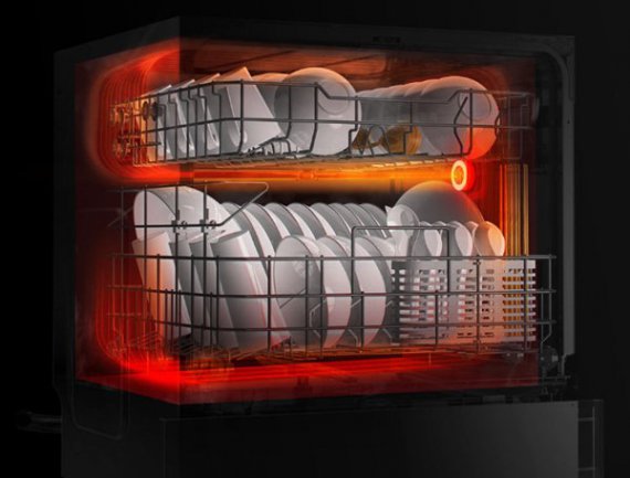 Посудомийна машина може ефективно усувати жир, нагріваючи воду до 70°С, а також має функцію високотемпературної стерилізації посуду. Для цього використовується японська система сушки гарячим повітрям.