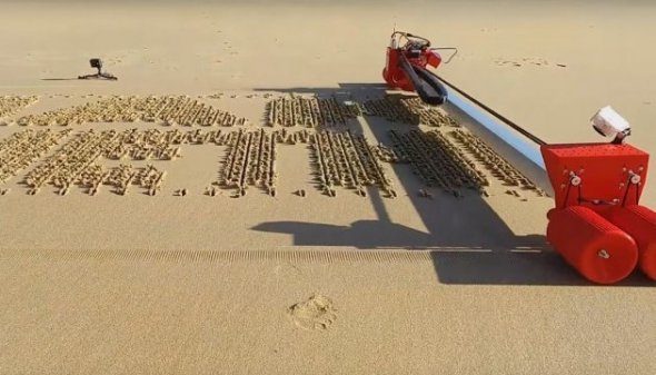 Він нагадує принтер у вигляді довгої планки на колесах, яка котиться по пляжу і друкує текст.