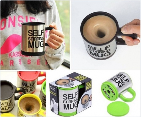 Чашка-мішалка з вентилятором при натисканні на спеціальну кнопку, розташовану на ручці, автоматично змішує вміст у ній. Чайну ложку використовувати не потрібно. Цей подарунок підійде для офісних працівників, у яких ложка не завжди під рукою. Вартість такої чашки близько 250 гривень.